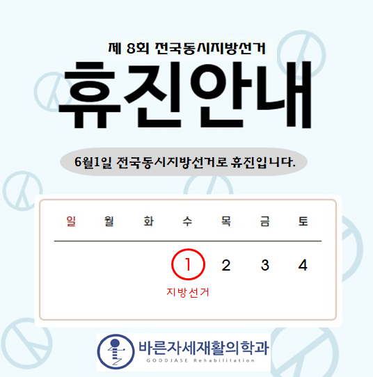 2022년 6월 선거일 휴진 안내 페이지 정보 바른자세재활의학과 작성일22-05-09 16:18 조회16,746회 이전글 다음글 목록 본문 진료예약 및 내원에 참고하시기 바랍니다.