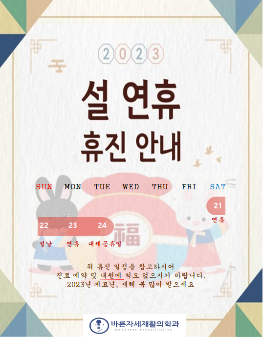 2023년 설날 연휴 휴진 페이지 정보 바른자세재활의학과 작성일23-01-02 12:04 조회15,932회 이전글 다음글 목록 본문 1/21(토) ~ 1/24(화) 병원 휴진입니다.위 안내문 참고하시길 바랍니다.